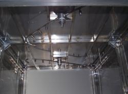 | Душевая установка камерного типа – ДУК-1Назначение: предназначена для охлаждения свежесваренных колбасных изделий в диапазоне температур от 72оС до 25-30оС.Конкурентные преимущества камер «Техтрон+»: простота и удобство использования всего комплекса оборудования надежность и долговечность всех узлов автоматики и составляющих оборудования низкий расход воды равномерность охлаждающего эффекта на весь объем загружаемого продукта наличие датчика температуры в продукте Душевая установка типа ДУК представляет собой тонкостенную камеру с дверью, внутри которой под потолком расположены форсунки распыляющие воду. Система форсунок подобрана таким образом, чтобы промывка продукта по всему объёму камеры происходила равномерно. Пульт управления позволяет проводить душирование как в ручном режиме, так и в автоматическом режиме непрерывно или импульсами. При постоянном душировании расход воды составляет 3,0м3/час на одну раму. При периодическом душировании расход воды может быть разным, в зависимости от программы, и в среднем составляет около 1,5м3/час на одну раму. Подача воды регулируется электропневматическими клапанами. Душирование может протекать по заданному времени или по температуре внутри продукта. Система отвода воды Сброс воды из камеры во время душирования происходит через установленный в полу камеры внутренний водосбор с последующим отводом в систему канализации. Основные технические и конструктивные характеристики ДУК-1 Кол-во вмещающихся рам (коптильных тележек) шт. 1 Номинальная загрузка кг. 300 Габаритные размеры установки мм 2500х1500х3300 Требования к монтажу и подключениям установки Подключение к электросети: 380V, 50-60Гц, 3 фазы Коммуникации для подвода воды к душевой установке, давлением не менее 3 атм. Наличие канализационного трапа дренажной канализации цеха в месте установки Подключение к системе подачи сжатого воздуха 4-6 атм. Поставщик: ПКП Техтрон+ Цена: Договорная | |||||||||||