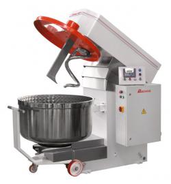| Тестомесильная машина с подкатной дежой "Прима-300"Двухскоростная тестомесильная машина с возможностью интенсивного замеса на повышенной скорости для замешивания пшеничного, ржано-пшеничного, ржаного теста и теста для кондитерских изделий. Предназначена для эксплуатации в 1-3-сменном режиме в условиях промышленного производства.Выпускается в двух вариантах: •«Прима-300» исполнение 01 - с полуавтоматической системой управления •«Прима-300» с процессорной многофункциональной системой управления с сенсорной панелью. Схема замеса: спиральный месильный орган, центральный отсекатель, подкатная вращающаяся цилиндрическая дежа из нержавеющей стали емкостью 300 литров. Применение интенсивного замеса: сокращает время замеса, принципиально улучшает качество готовой продукции увеличивая объем изделий, мякиш становится более эластичным, пористость - равномерной и мелкой, замедляется черствение, компенсирует, в определенной степени, недостатки муки низкого качества. Процессрная система управления на базе промышленного контроллера с сенсорной панелью управления обеспечивает: ввод, редактирование, хранение и воспроизведение в автоматическом режиме до ста 10-шаговых программ замеса теста с возможностью задания технологических параметров в каждом шаге возможность корректировки параметров программы без прерывания цикла временное прерывание цикла по требованию оператора, с последующим его продолжением тестирование и диагностику работоспособности узлов и агрегатов машины мониторинг аварийных ситуаций с автоматическим отключением машины автоматическое ведение архивов: замесов, аварийных событий с диагностикой неисправностей, учета времени наработки машины контроль нагрузки на приводы рабочих органов машины возможность совместной работы с дозирующими станциями сыпучих и жидких компонентов подключение к технологическому компьютеру с возможностью удаленного управления (опционально) управление загрузчиком опары и автоматом выгрузки теста, при наличии этих устройств. Полуавтоматическая система управления позволяет: •устанавливать общее время замеса и время замеса на малой скорости •автоматически переключать вращение месильного органа с малой скорости на повышенную •временное прерывание цикла по требованию оператора, с последующим его продолжением •отрабатывать цикл замеса только на малой, или только на повышенной скорости •включать прямое или реверсивное вращение дежи на малой скорости замеса •автоматически останавливать машину по окончании времени замеса с подачей звукового сигнала Для надежной работы и удобства эксплуатации конструкцией предусмотрено: •элементы конструкции, контактирующие с тестом, выполнены из нержавеющей стали •реверсивное вращение дежи на малой скорости •гидравлический привод подъема - опускания траверсы и фиксации дежи, узлы и агрегаты гидравлической системы - от лучших европейских производителей •привод вращения месильного органа - групповая клиноременная передача •привод вращения дежи с устройством плавного пуска двигателя, исключающий повреждение элементов конструкции в случае удара шестерен привода «зуб в зуб» •патрубки на крышке дежи для загрузки сыпучих и жидких компонентов в автоматическом и ручном режимах •дежи Д-300 с улучшенной маневренностью и возможнос